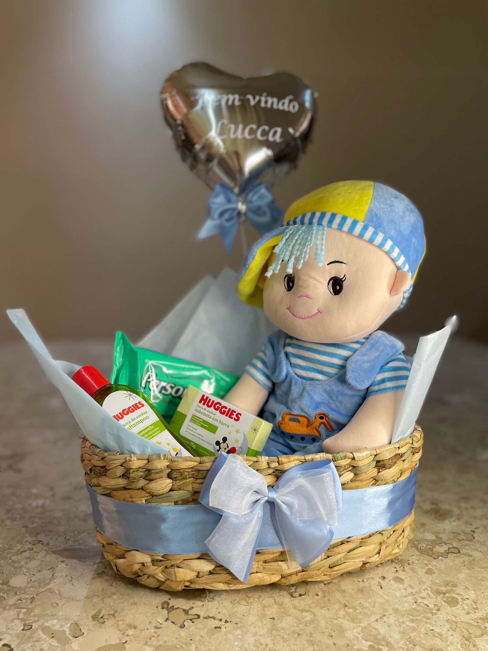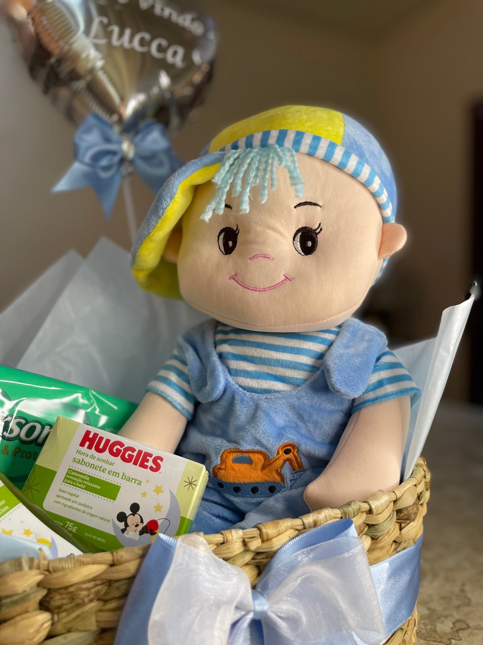1 boneco 40cm 1 pt de lenço umidecido 1 shampoo Huggies 1 sabonete barra Huggies 1 cachepot de taboa 1 balão metalizado personalizado 1 cartão de mensagem personalizado Taxa de entrega de acordo com a região