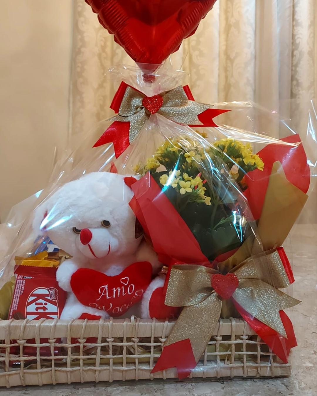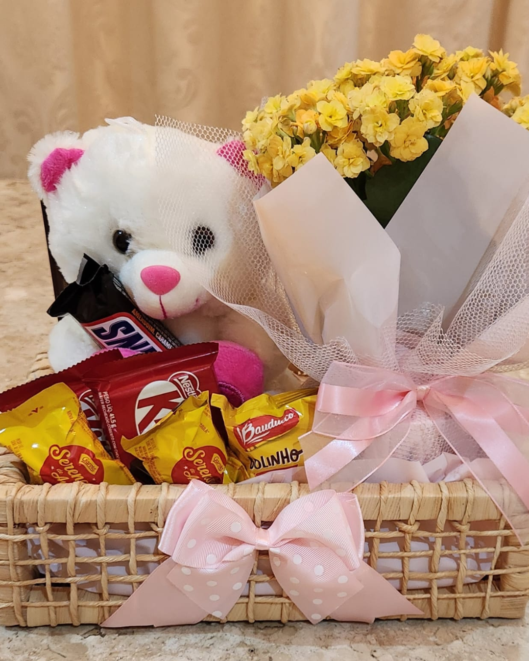 A Cesta chocolate com flor e ursinho na bandeja é composta por: 1 barra de chocolate 1 cx de Bis 2 kit kat 2 bombons Garoto 1 barrinha de chocolate 1 bolinho Bauducco 1 flor kalanshoi ( cor de acordo com a disponibilidade no momento) 1 ursinho de pelúcia 1 bandeja de palha de milho 1 balão metalizado ( frase: Te Amo ou Feliz aniversário) 1 cartão de mensagem personalizado.